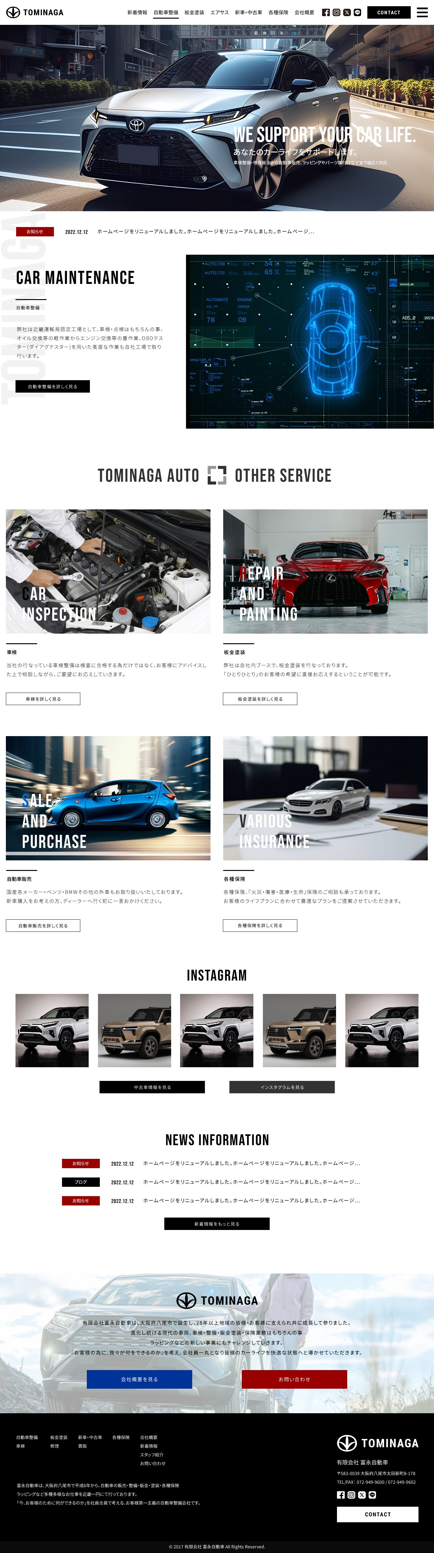 大阪府八尾市で平成6年から、自動車の販売・整備・鈑金・塗装・各種保険 ラッピングなど多種多様なお仕事を近畿一円にて行っている会社です。 ホームページデザイン・Wordpressサイト構築。 Elementorにてクライアント側でも楽に編集ができるサイトをご提供。 カスタムフィールドにて施工事例や分譲物件情報などを簡単に投稿できるように構築しました。 Instagramを連動。