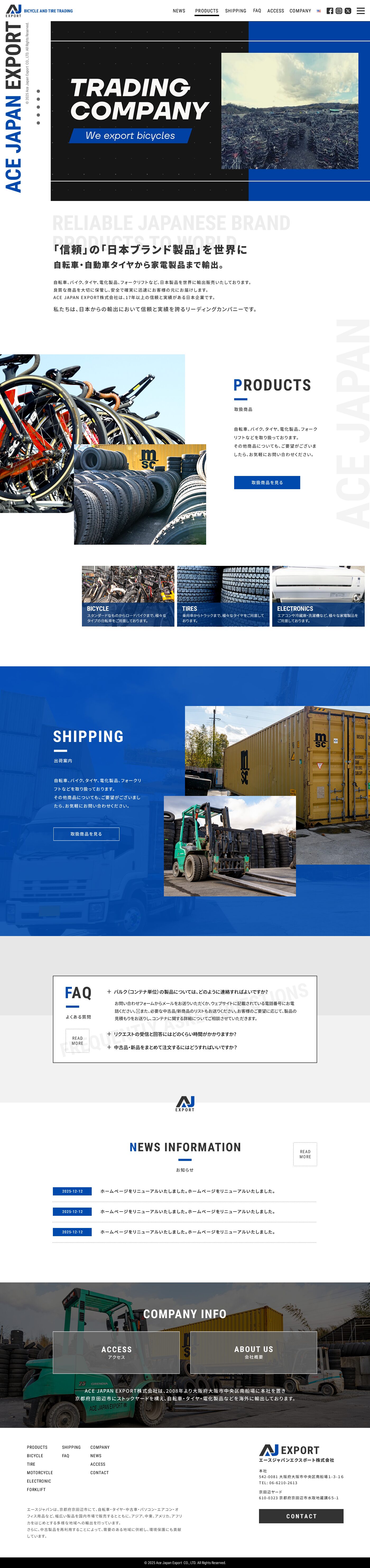 自転車、バイク、タイヤ、電化製品、フォークリフトなど、日本製品を世界に輸出販売。 ACE JAPAN EXPORT株式会社は、17年以上の信頼と実績がある日本企業です。 ホームページデザイン・Wordpressサイト構築。 Elementorにてクライアント側でも楽に編集ができるサイトをご提供。 カスタムフィールドにて施工事例や分譲物件情報などを簡単に投稿できるように構築しました。 PinterestやInstagramを連動。 写真・動画撮影からドローン撮影、動画編集までを行いました。